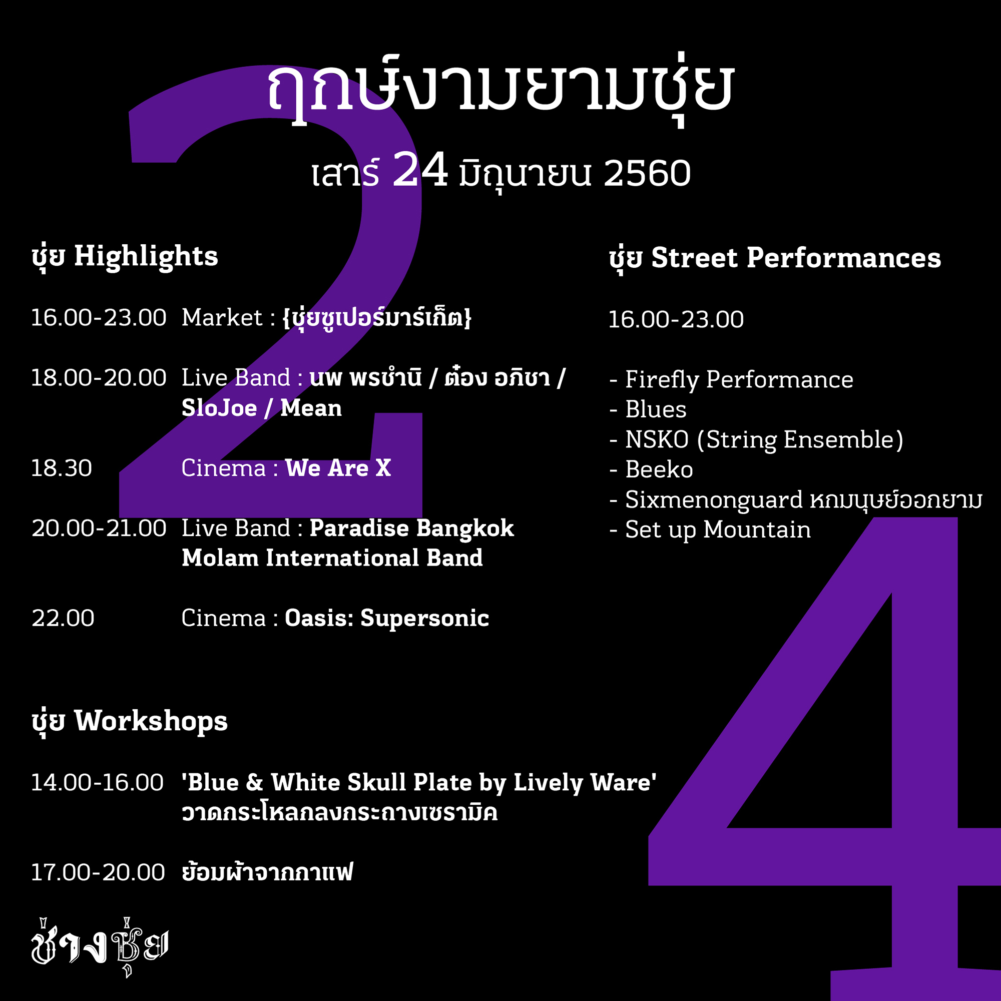 'ช่างชุ่ย' โรงผลิตความคิดสร้างสรรค์...ก่อจินตนาการเจ็บๆ ด้วยรสชาติเหนือชั้นจากอาหาร เครื่องดื่ม ขนมหวาน ที่คัดรสมือตั้งแต่ระดับเชฟมิชลินสตาร์ ถึงร้านในตำนาน...สนุกตากับชุมนุมหนังสารคดีชั้นเยี่ยม...สนุกใจกับซุปเปอร์ตลาดที่รวมของฮิปนับพันชิ้น...สนุกปรี้ดแตกกับคอนเสิร์ตสุดแนวจากสมาพันธ์ดนตรีกว่าสิบค่ายเพลงปัง...ขยับรอยหยักในสมองซีกซ้ายขวา จากนิทรรศการ งานศิลปะ งานทอลค์ งานประดิษฐ์ จะเรียนบินผาดโผนโดรนทะยาน หรือวิ่งผ่านความสดชื่นจากไม้งาม ใน Glass House Skull Corner...พบร้อยความสนุกเหนือมนุษย์ปุถุชน